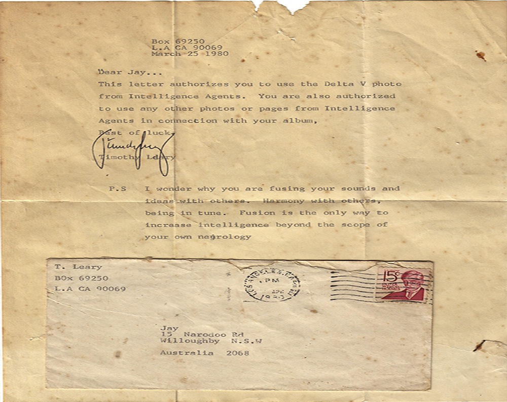 A pivotal influence on Jay's thinking was the book Intelligence Agents by Timothy Leary (24mb PDF download). It radically expanded his worldview as a young adult. Jay actually wrote to Leary requesting permission to quote the book in his songs - and received a personal reply. Leary wrote: "I wonder why you are fusing your sounds and ideas with others. Harmony with others, being in tune. Fusion is the only way to increase intelligence beyond the scope of your own neurology. Best of luck." (Click image to view the letter).